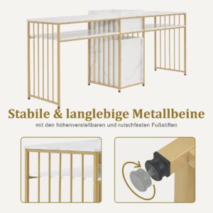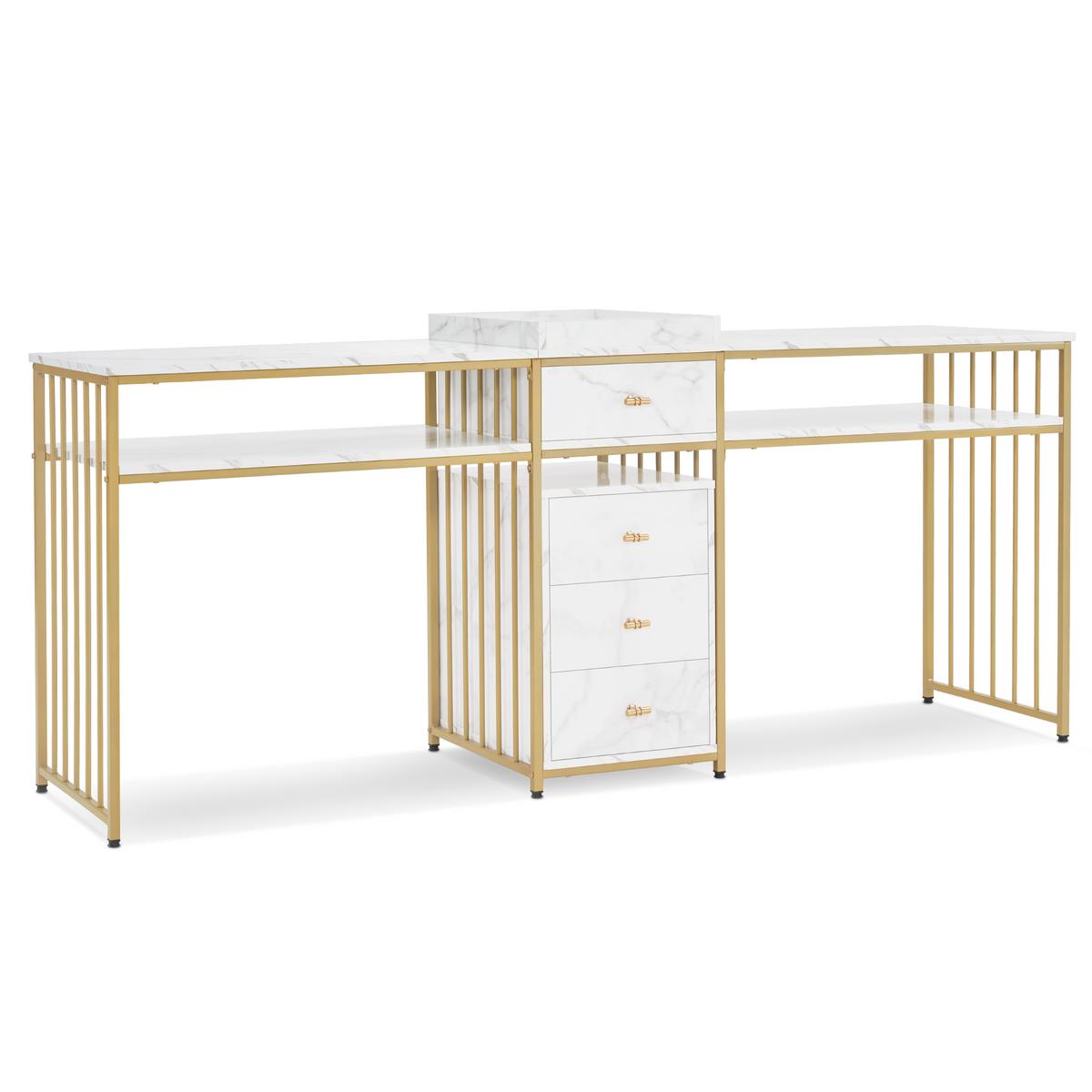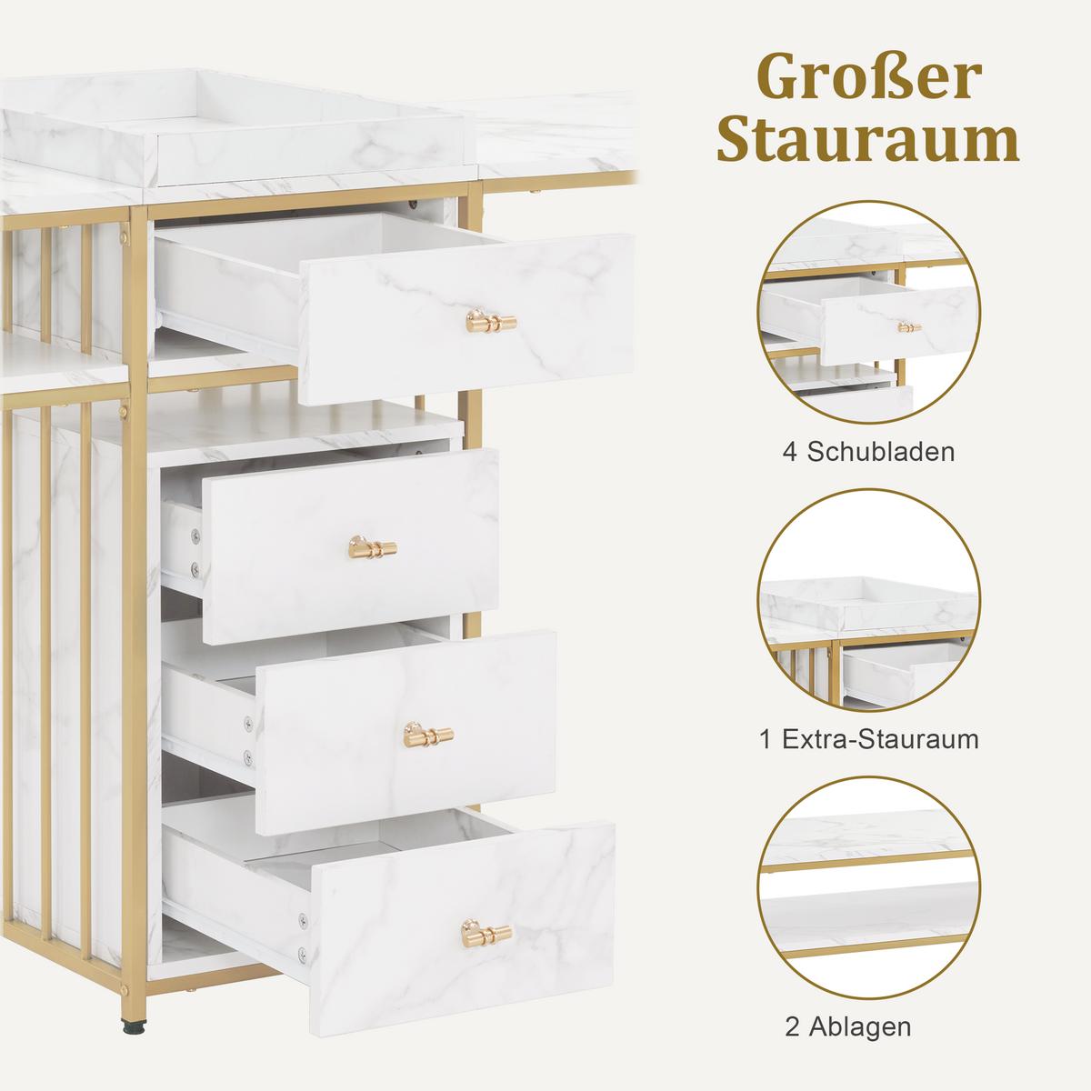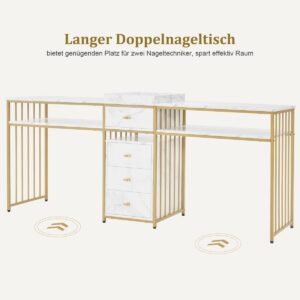 Marmor trifft Gold: zeitlose Eleganz und luxuriöses Flair; das simple Designkonzept, feine und exquisite Verarbeitung, ist nicht nur ein Möbel, sondern auch ein leichtes Luxuskunstwerk mit modischem Charme und Verlockung, das Ihnen ein wunderbares Lebensvergnügen beschert; 2-Sitzer Nageltisch bietet ausreichend Platz für zwei Nageltechniker, um bequem nebeneinander zu arbeiten und ermöglicht eine effiziente Raumnutzung