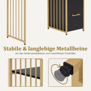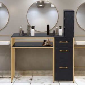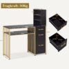 Das Regal, ein kleine und zwei große Schubladen können Ihre Bücher oder sämtliche Werkzeuge gut klassifizieren und aufbewahren. Das kann Ihre tägliche Arbeitseffizienz erheblich verbessern. Die rutschfesten Fußstifte können den Boden schützen. Der goldene Metallrahmen sieht luxuriös, elegant und modern aus, ist für jede Haushalt auf jeden Fall ein auffälliges und praktisches Möbel. Sie könnten den Schminktisch sowohl im Laden, sondern auch zuhause benutzen.