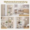 Das Standregal verfügt über fünf multifunktionale Fächer mit klarer Unterteilung und ausreichend Stauraum, in dem Kunstsammlerstücke, Bücher, CD-Player und mehr aufbewahrt werden können. Es eignet sich für verschiedene Szenarien wie Nagelstudios, Schönheitssalons, Wohnzimmer, Arbeitszimmer und Küchen. Das weiße und goldene Farbschema sowie das schlichte, geräumige Design lassen sich gut mit verschiedenen Möbelstücken kombinieren und passen in jeden Raum. Dieses sowohl stilvolle als auch praktische Regal besteht aus MDF-Platten und robusten Metallrahmen, was eine lange Lebensdauer des Produkts garantiert.