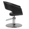 Die sehr schlanke, runde Basis mit verchromtem Metall-Finish sorgt für ein hochwertiges Erscheinungsbild und bietet gleichzeitig mehr Beinfreiheit für ergonomisches Arbeiten. Mit der arretierbaren Hydraulikpumpe und der hochwertigen Bremse stellst du die Sitzhöhe präzise und sicher ein – stabil, professionell und zuverlässig. Die schwarze PVC-Polsterung ist pflegeleicht und Salonready.